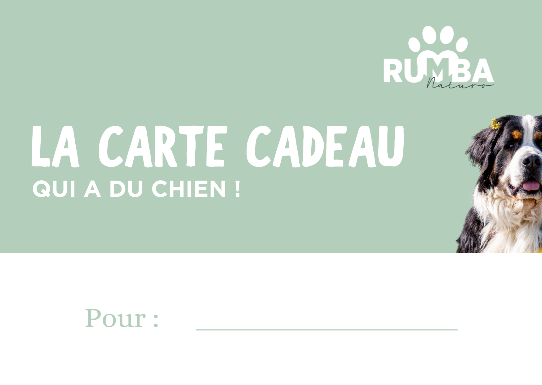 Tu hésites entre plusieurs soins ? Tu veux faire plaisir sans te tromper, ou tu manques simplement de temps pour choisir ? La carte cadeau Rumba Naturo est la solution idéale pour offrir un moment de bien-être naturel à un chien (et à son humain )